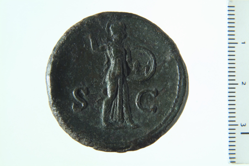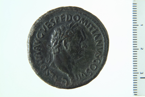 Testa laureata di Domiziano a d.; contorno perlinato.