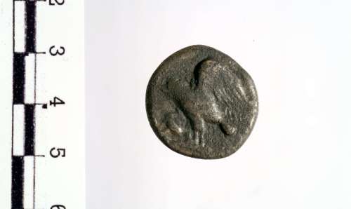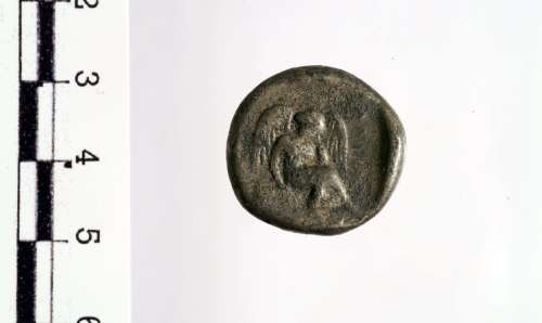 Aquila a s. con le ali spiegate; ai suoi piedi un'airone morto
