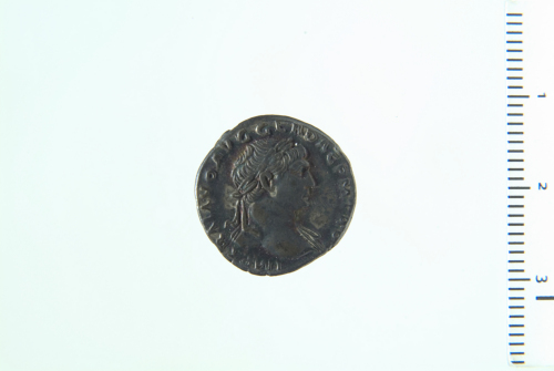 Busto laureato di Traiano a d., drappeggiato sulla spalla s., di tre quarti in avanti; contorno perlinato (?).
