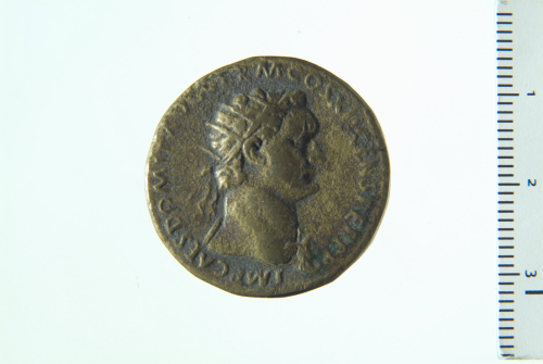 Busto laureato di Domiziano a d., con egida; contorno perlinato.