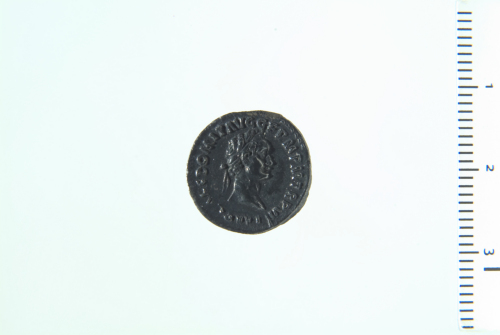 Testa laureata di Domiziano a d.; contorno perlinato.