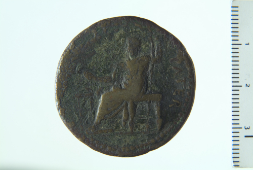 Divo Augusto radiato e drappeggiato seduto a s. con pramo d'alloro e scettro davanti ad altare; contorno perlinato