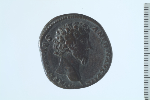 Testa nuda di Marco Aurelio a d.; contorno perlinato.