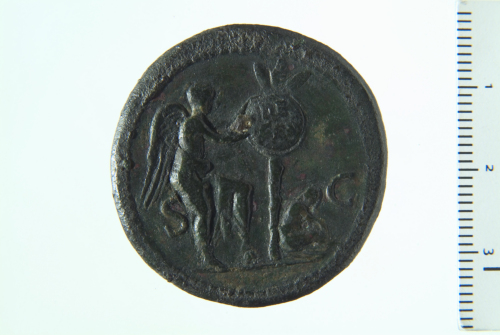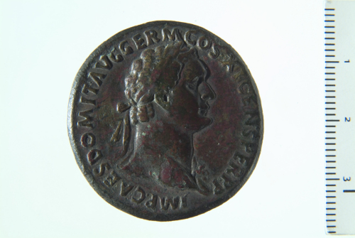 Busto laureato di Domiziano a d., con egida; contorno perlinato.