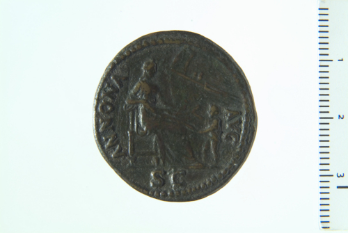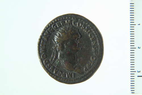 Testa radiata di Domiziano a d., con egida; contorno perlinato.