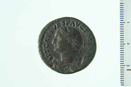 Testa laureata di Tito a s.; contorno perlinato.