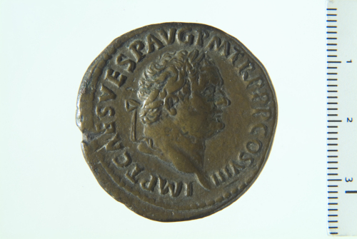 Testa laureata di Tito a d.; contorno perlinato.