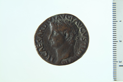 Testa laureata di Tiberio a s.; contorno perlinato