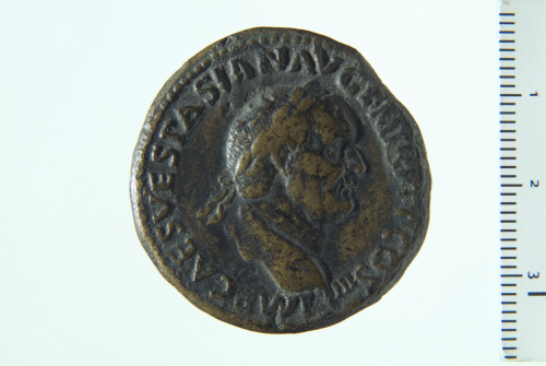 Testa laureata di Vespasiano a d.; contorno perlinato.
