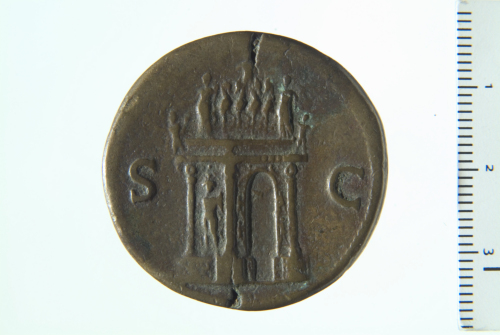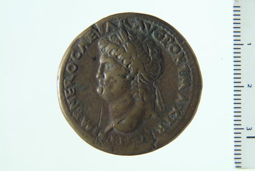 Testa laureata di Nerone a s.; in basso a s., in corrispondenza del taglio del collo, globetto; contorno perlinato.