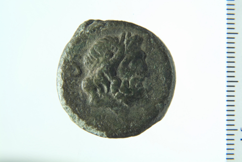 Testa laureata di Saturno a d.; contorno perlinato