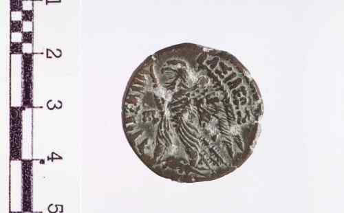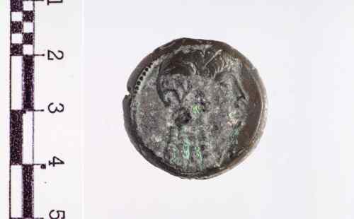 Testa femminile (Iside ?) a d. con lunghi boccoli e corona di spighe