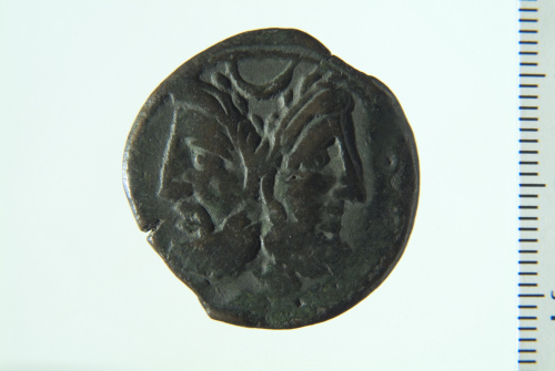 Testa barbata di Giano bifronte; contorno perlinato