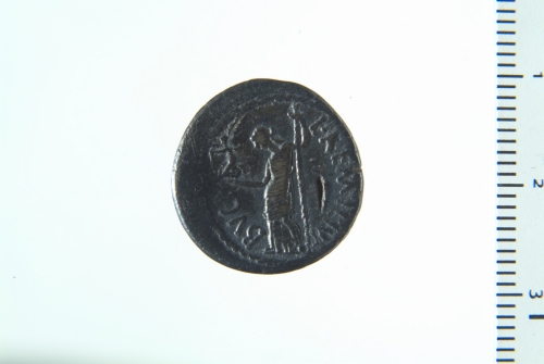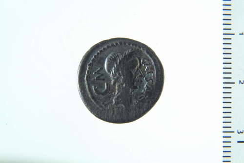 Testa laureata di Cesare a d., a s. crescente lunare rivolto verso l'alto; contorno perlinato