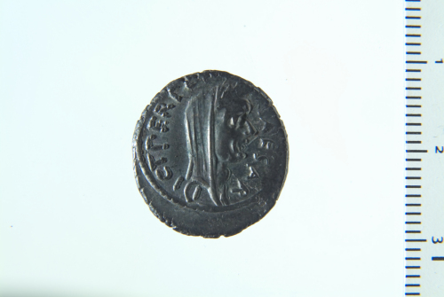 Testa laureata e velata di Cesare a d.; contorno perlinato