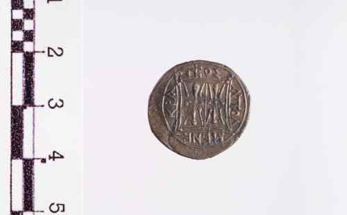 Vacca, stante a s., che allatta un vitello; in esergo: spiga di grano