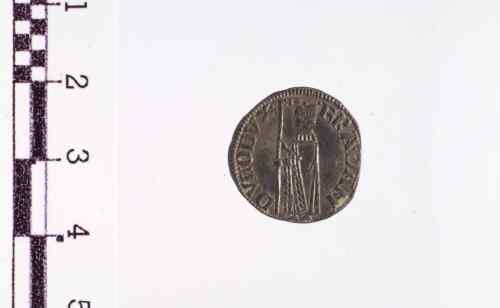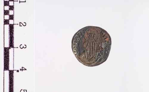 Il Doge in piedi a s., con berretto ducale e manto, tiene con ambo le mani il vessillo con croce, la cui bamderuola è volta a d., sulla banderuola, 3 globetti; cerchio perlinato.