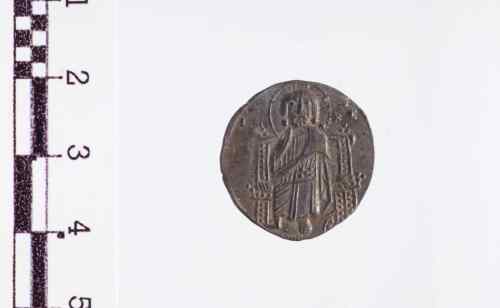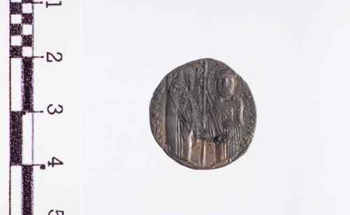 S. Marco, in piedi a d., porge il vessillo al Doge a s. in piedi.
