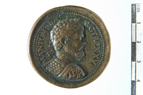 Busto laureato, drappeggiato e corazzato di Marco Aurelio a d.; contorno perlinato