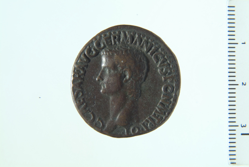 Testa di Caligola a s.; contorno perlinato