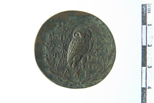 Testa di Atena a d. con elmo crestato e istoriato; contorno perlinato