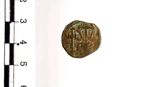Mezze figure frontali affiancate di Costantino V, a s.,e di Leone IV, a d., entrambi con clamide, corona e kakia; tra le teste, una croce; a s., K; campo d. illeggibile
