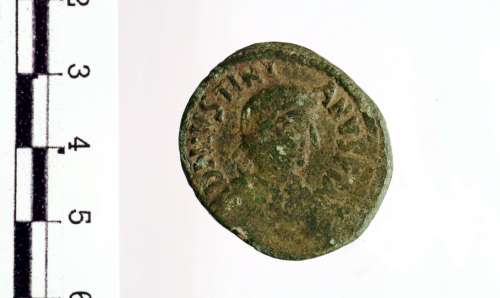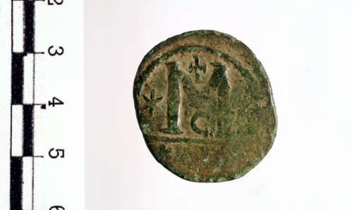 Busto diademato, drappeggiato e corazzato di Giustiniano I a d.; sul petto, simbolo non distinguibile