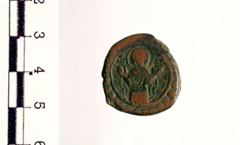 Busto frontale e nimbato di Cristo, con mano d. benedicente e libro nella mano s.; contorno perlinato