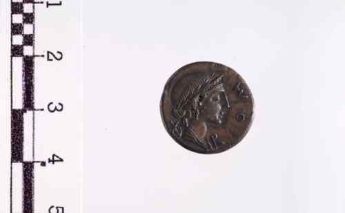 Busto femminile laureato, drappeggiato e con diadema. Cerchio di puntini.