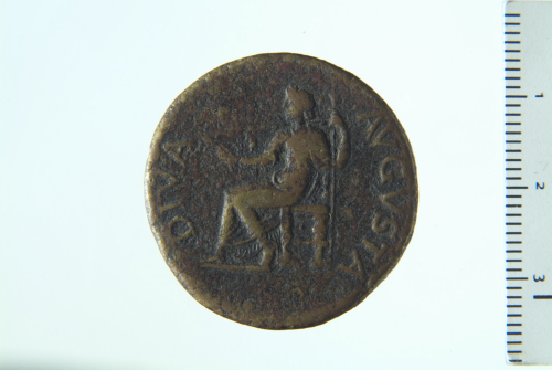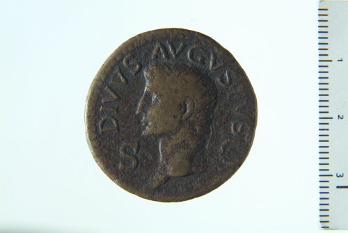 Testa del Divo Augusto radiato a s.; contorno perlinato