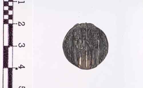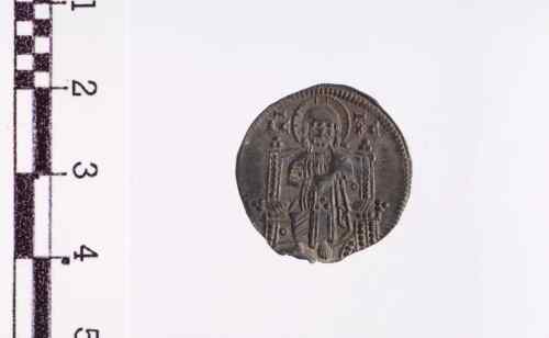 S. Marco in piedi a d. porge il vessillo al Doge a s. in piedi.