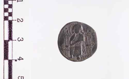 S. Marco, nimbato e barbato in piedi a d. di fronte, tiene con la s. il libro dei Vangeli e con la d. porge il vessillo al Doge barbato in piedi a s. di fronte. Il Doge indossa un ricco manto gemmato, tiene con la s. un rotolo (volumen) e con la d. regge il vessillo, la cui banderuola, con croce, è volta a s.