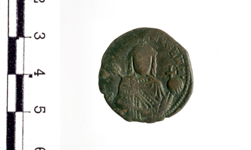 Busto frontale di Romano I con clamide e corona; labaro nella mano d. e globo sormontato da croce nella mano s.
