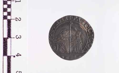 Sopra linea orizzontale, S. Marco a s. seduto in trono volto a d., porge il vessillo, sormontato da croce e con banderuola volta a d., al Doge genuflesso che lo prende con ambo le mani.