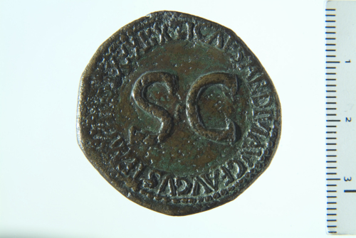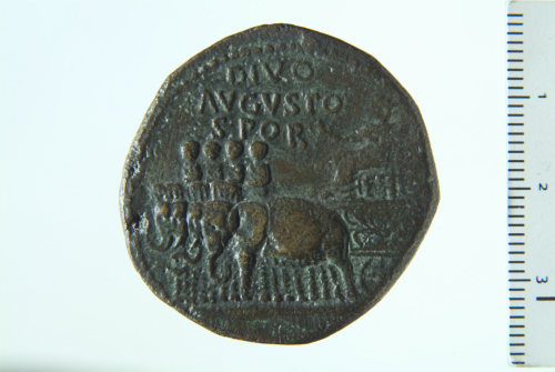 Divo Augusto radiato su quadriga di elefanti guidata da quattro uomini a s., con ramo di alloro e scettro; contorno perlinato