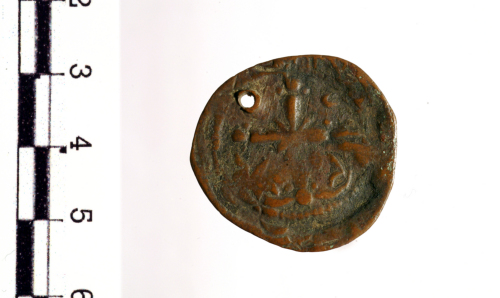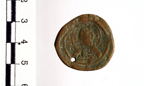 Busto frontale e nimbato di Cristo, con mano d. benedicente e libro nella mano s.