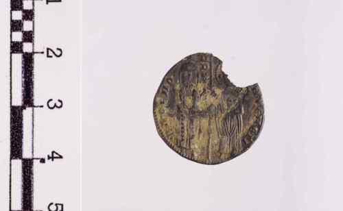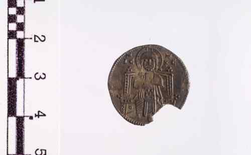 S. Marco in piedi a d. porge il vessillo al Doge a s. in piedi.