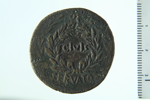 legenda entro corona di quercia affiancata da due rami di alloro; contorno perlinato