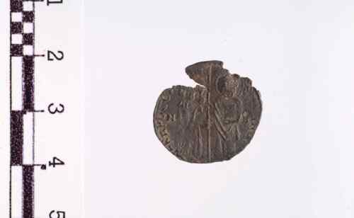 S. Marco a d., in piedi di fronte, porge il vessillo al Doge a s. in piedi, volto a d.