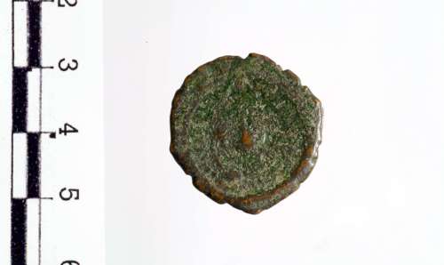 Busto frontale, elmato e corazzato, di Giustiniano I con globo crucigero e scudo; a d., croce