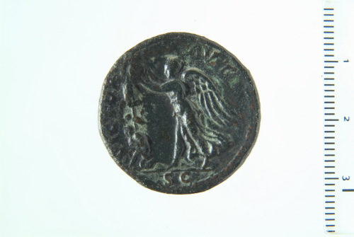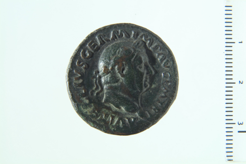 Testa laureata di Vitellio a d.; contorno perlinato.