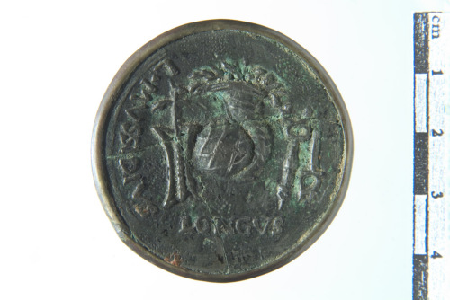 Busto drappeggiato di Cesare a d.; contorno a bordo