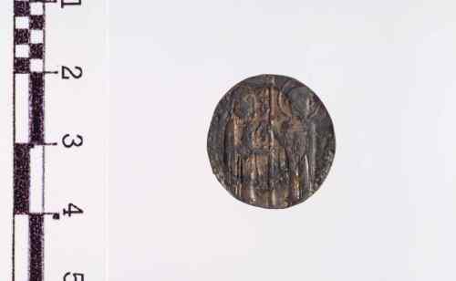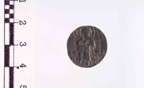 S. Marco a d., in piedi di fronte, porge il vessillo al Doge a s. in piedi, di fronte.