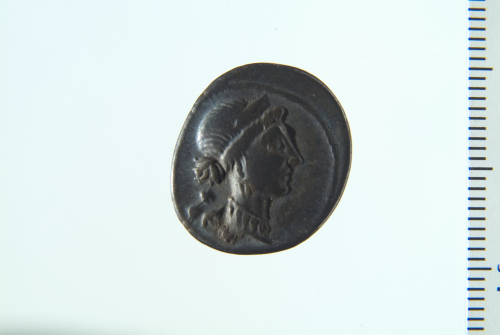 Testa di Venere diademata a d., a s. Cupido; contorno perlinato