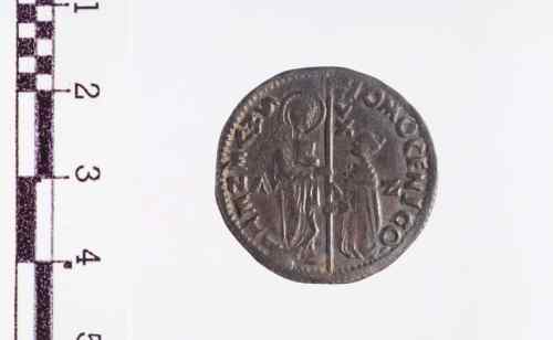 S. Marco, in piedi a s., porge il vessillo al Doge genuflesso che lo prende con ambo le mani.