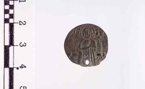 S. Marco a d., in piedi di fronte, porge il vessillo al Doge a s. in piedi, di fronte.