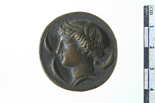 Testa di Aretusa a d., circondata da quattro delfini