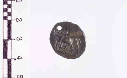 Vacca, stante a d., che allatta un vitello; a d.: cornucopia; in esergo: timone