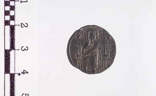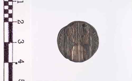 S. Marco a d., in piedi di fronte, porge il vessillo al Doge a s. in piedi, di fronte.