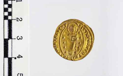 S. Marco, in piedi a s., porge il vessillo al Doge genuflesso, che lo prende con ambo le mani; punto sotto il braccio d. del Santo.